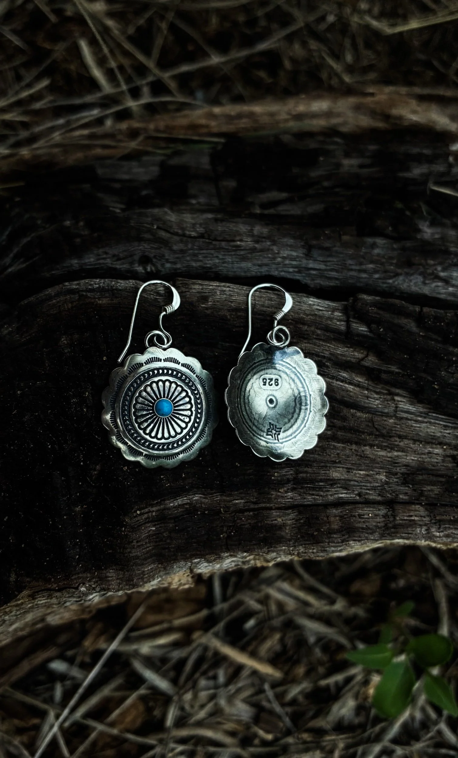 Image 1 of 3 Image 2 of 3 Image 3 of 3 Concho Earrings $85.00 Sterling & turquoise Purchase Added! Sterling & turquoise