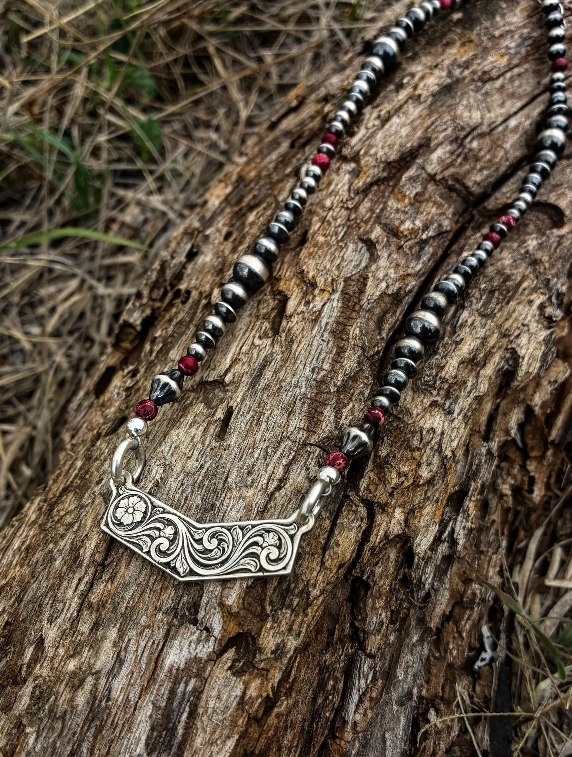 Image 1 of 2 Image 2 of 2 Red Jasper Necklace $250.00 16” 4-8mm Sterling pearls & red jasper Sterling laser engraved bar pendant Purchase Added! 16” 4-8mm Sterling pearls & red jasper Sterling laser engraved bar pendant