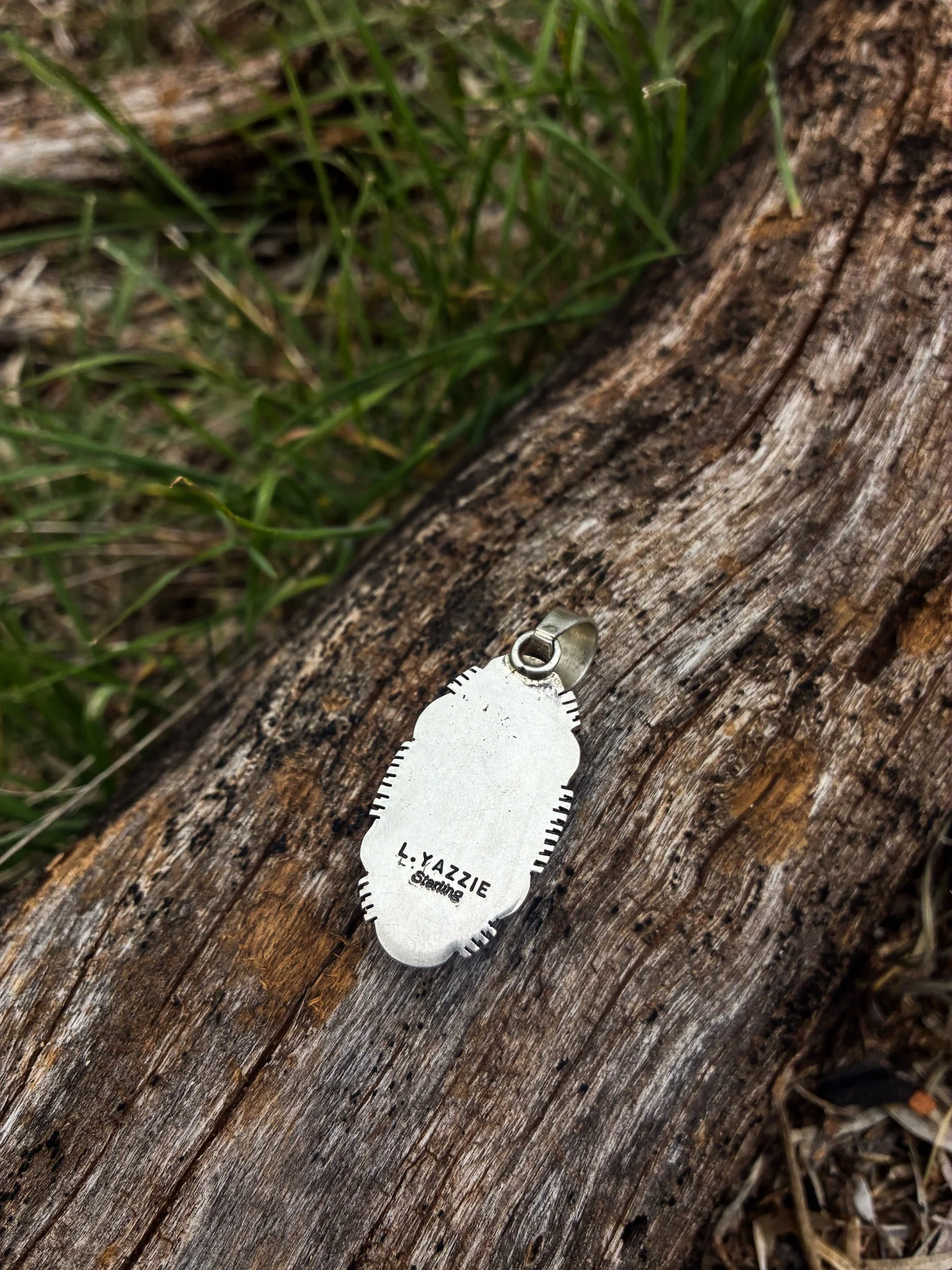 Leslie Yazzie is a Navajo silversmith that has been making jewelry since the 1970s. Not much information is known about Leslie’s personal life. The back of the pendant is signed with her makers mark, “L. YAZZIE”