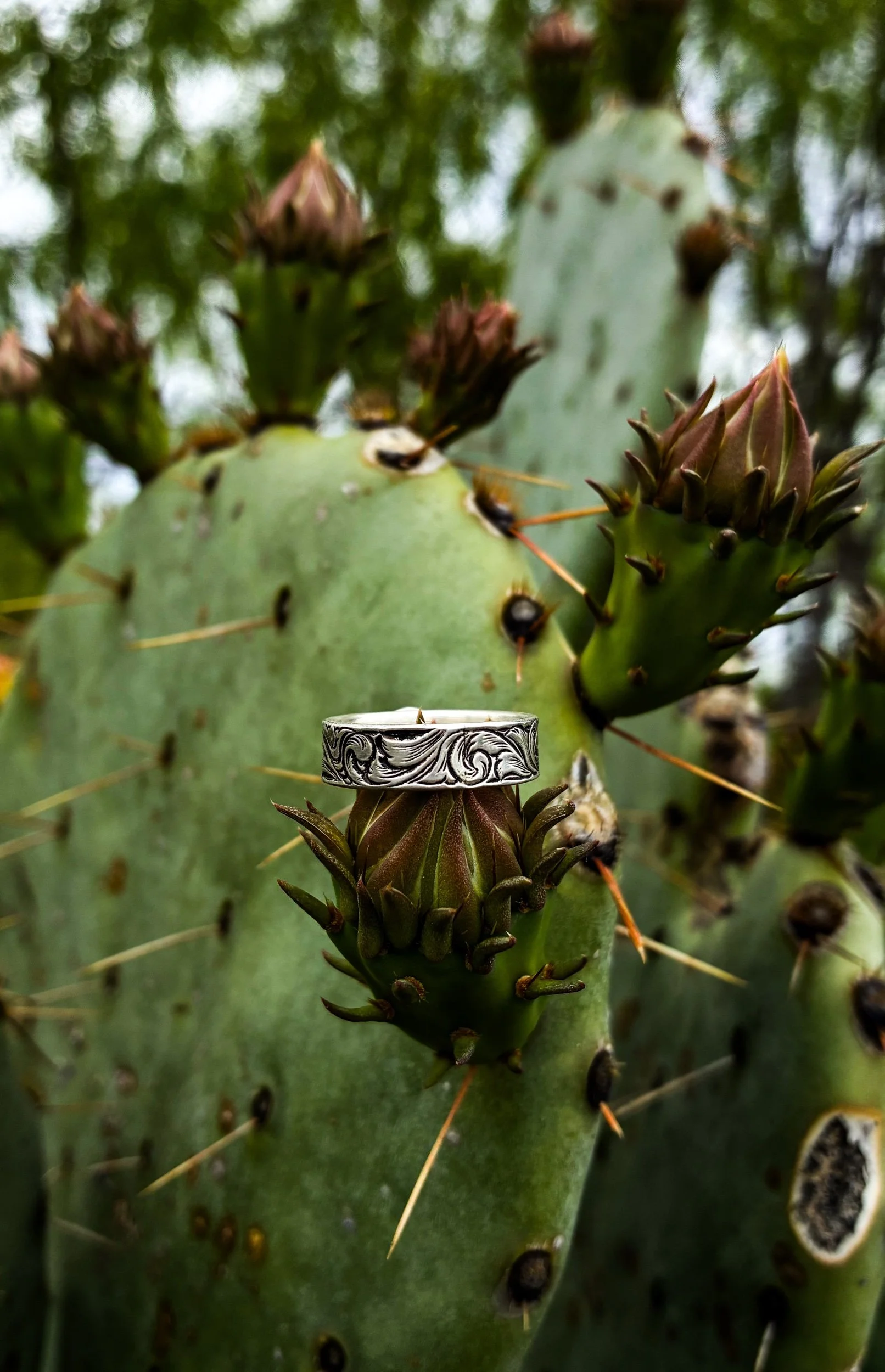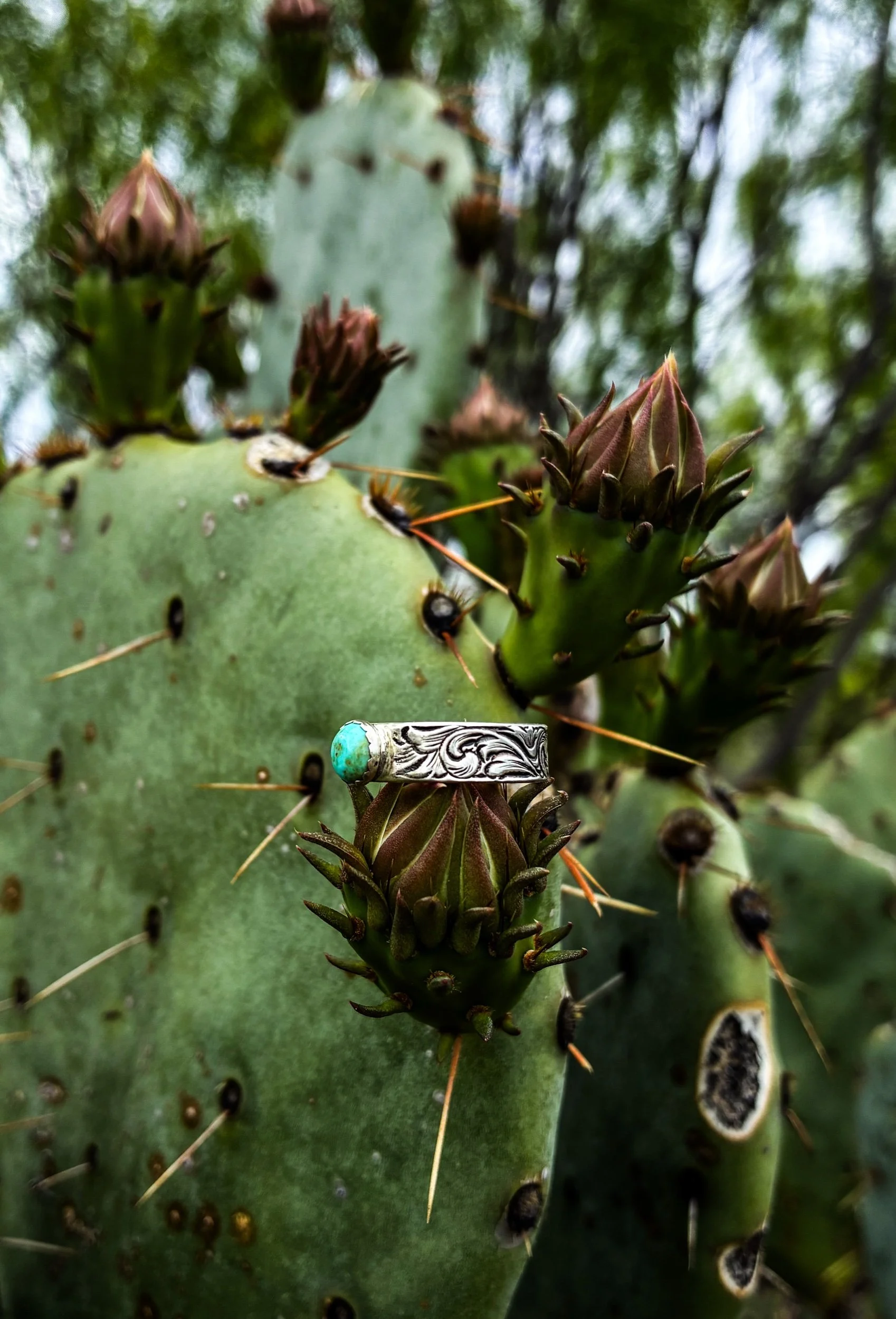 Image 1 of 2 Image 2 of 2 Kingman Hand Engraved Ring Size 6.75 $325.00 Size 6.75Sterling silver & Kingman turquoise Hand made and hand engraved by Rontoo Hargrove Purchase Added! Size 6.75Sterling silver & Kingman turquoise Hand made and hand engraved by Rontoo Hargrove